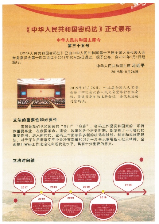 第四條 堅(jiān)持中國共產(chǎn)黨對密碼工作的領(lǐng)導(dǎo)。中央密碼工作領(lǐng)導(dǎo)機(jī)構(gòu)對全國密碼工作實(shí)行統(tǒng)一領(lǐng)導(dǎo),制定國家密碼工作重大方針政策,統(tǒng)籌協(xié)調(diào)國家密碼重大事項(xiàng)和重要工作,推進(jìn)國家密碼法治建設(shè)。
