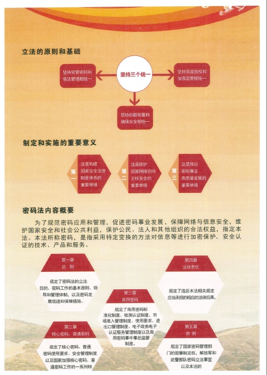 第三條 密碼工作堅(jiān)持總體國家安全觀,遵循統(tǒng)一領(lǐng)導(dǎo)、分級負(fù)責(zé),創(chuàng)新發(fā)展、服務(wù)大局,依法管理、保障安全的原則。